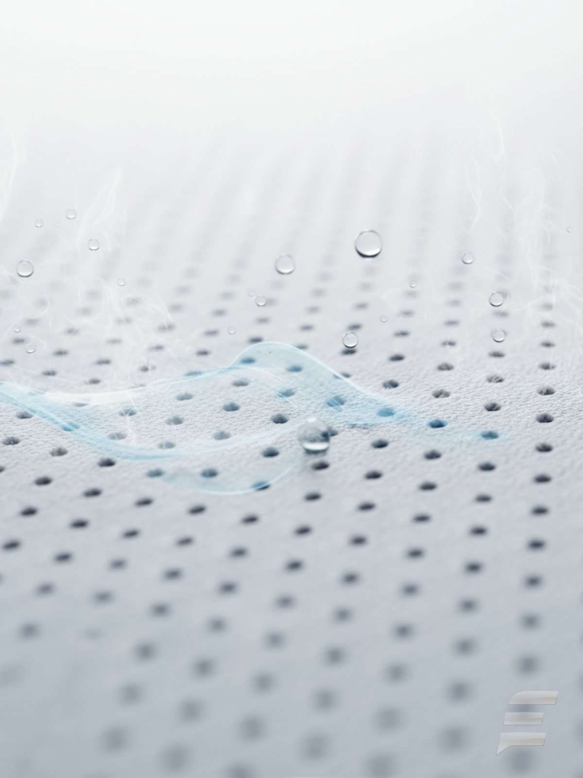 Ele absorve e transporta a umidade para fora da fibra, onde evapora rapidamente, mantendo o corpo seco e confortável mesmo sob alta intensidade.